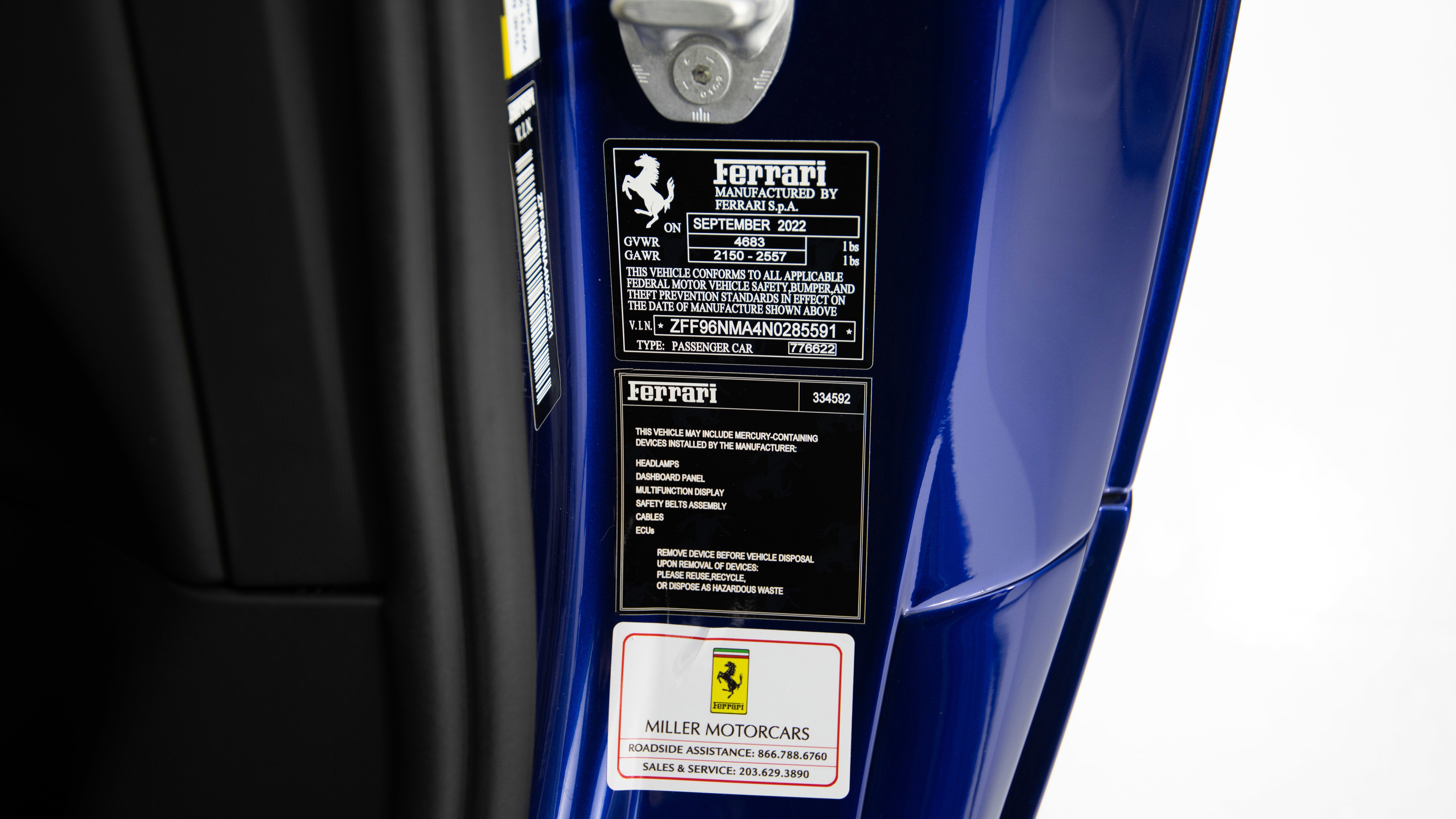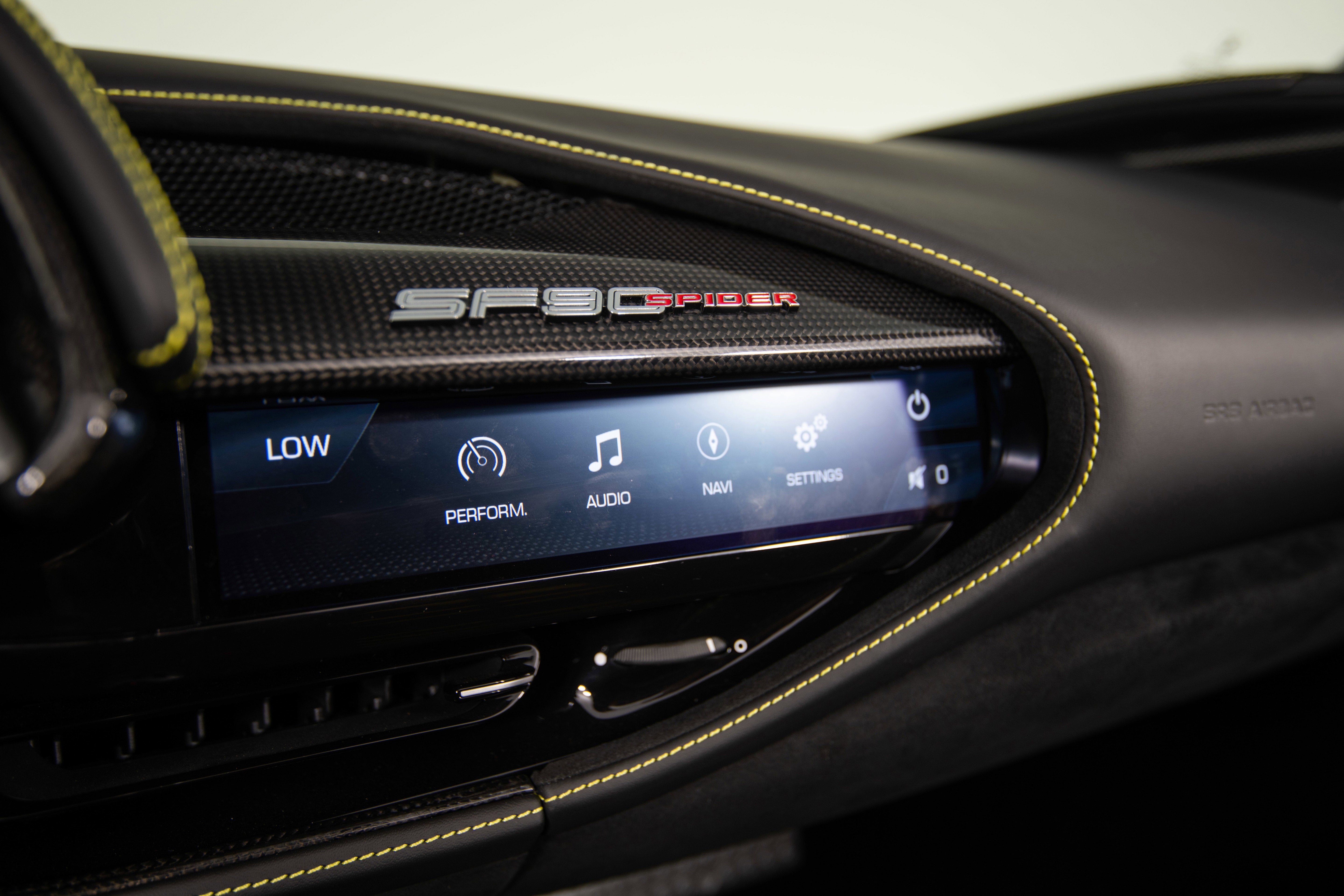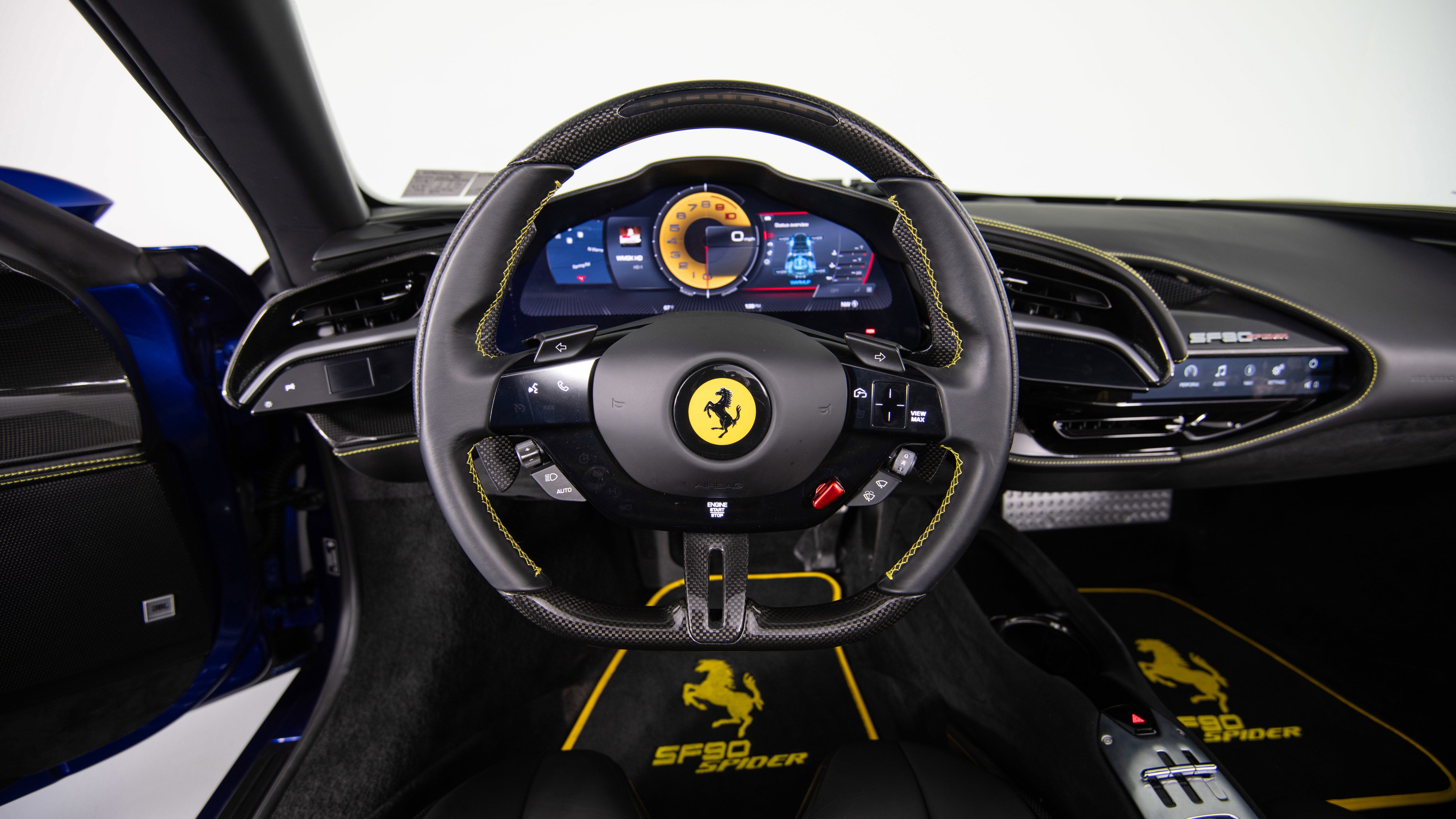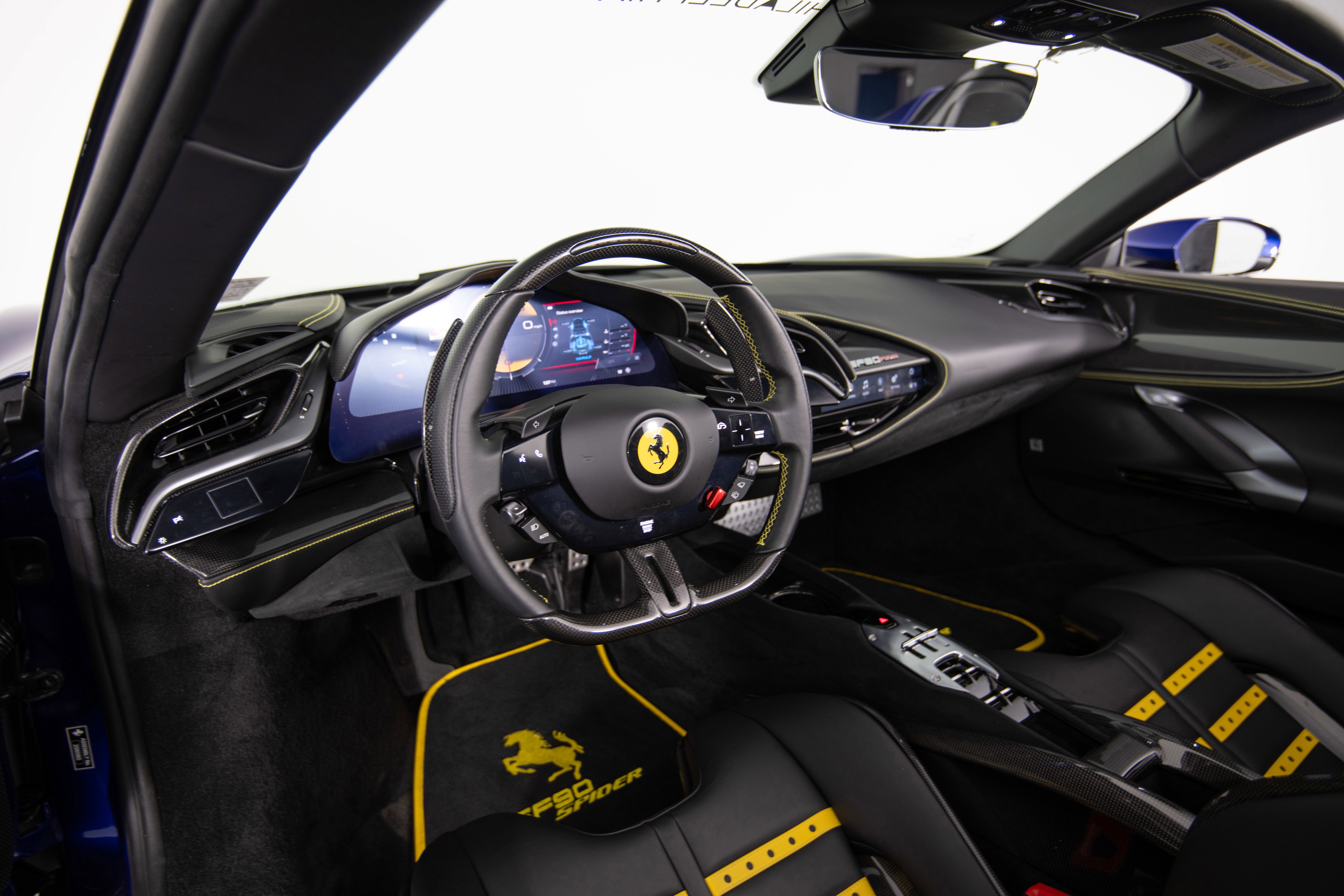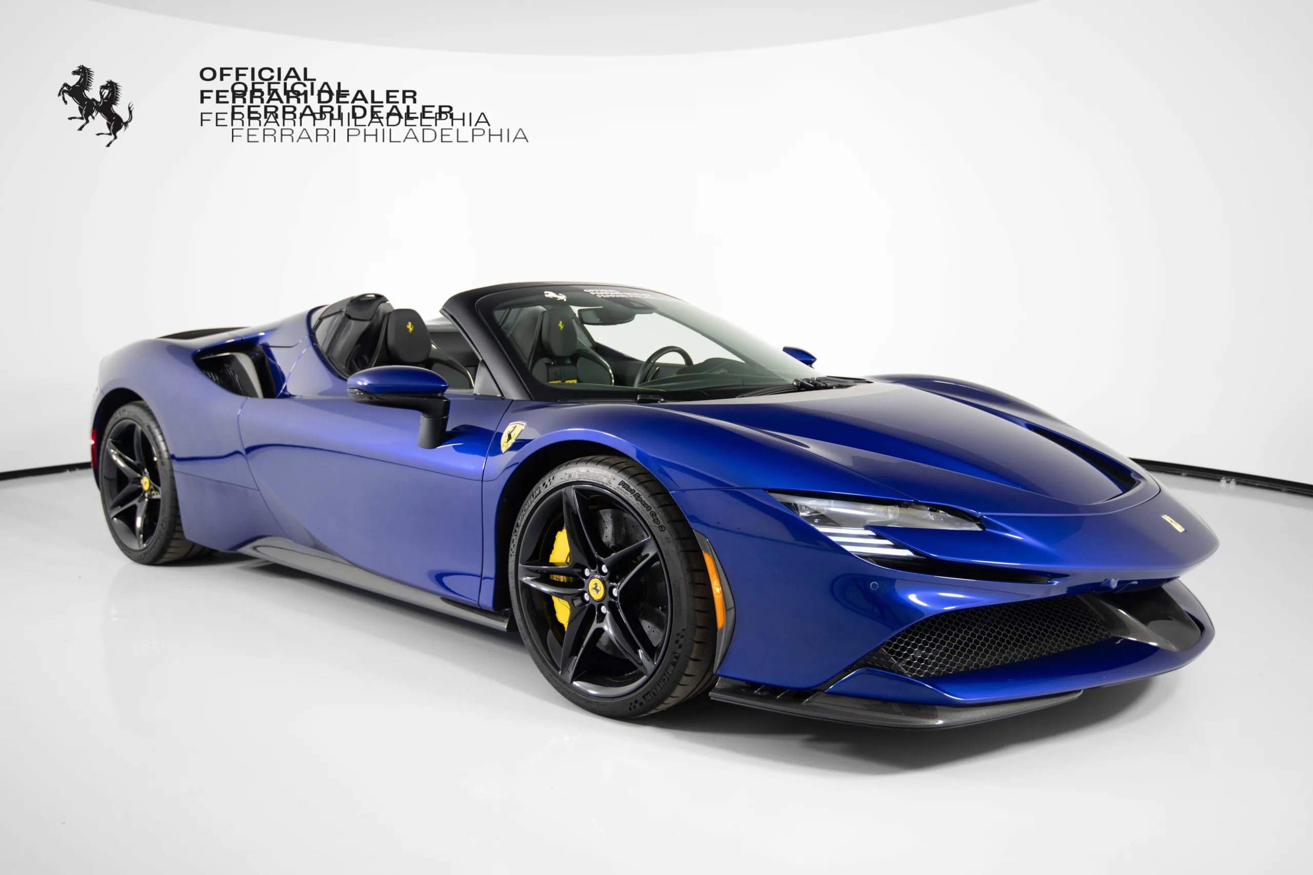 Ferrari Philadelphia is pleased to offer this 2022 Ferrari SF90 Spider with only 914 miles. This vehicle is being sold with the balance of the factory warranty valid until 12/19/2025 & is under the Ferrari Certified Pre-Owned Program. The Ferrari SF90 Spider is a groundbreaking plug-in hybrid convertible, setting new benchmarks in performance and technology. Equipped with a 4.0-liter twin-turbo V8 engine and three electric motors, it delivers a combined total of 1,000 horsepower, making it the most powerful production Ferrari to date. The SF90 Spider accelerates from 0 to 62 mph in just 2.5 seconds and reaches a top speed of 211 mph. Its eDrive mode allows for up to 15.5 miles of silent, electric-only driving, showcasing Ferrari's commitment to both performance and sustainability. The retractable hardtop adds versatility, enabling the thrill of open-air driving without compromising the car's aerodynamics or structural rigidity. The exterior color of this Ferrari is hand-finished in Blu Elettrico complemented by a Nero leather interior. The options on this SF90 Spider include: